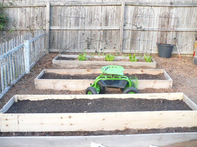 I made the paths in between my new beds just big enough for my little garden seat that I got for my birthday. This way I can sit and weed and I don't have to kneel or bend over!
