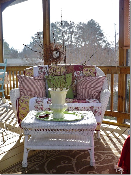 I put a quilt on the love seat. The Pusssywillow branches are from my backyard.