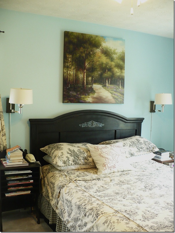 Love your room! I've been debating on whether to decorate our newly painted "Elusive Blue" room with brown or black. After seeing your pictures, I may very well go with black. Our bathroom is the same color and I'm already coming up with a black and white color scheme based on things I have on hand, including some toile fabric, a yard sale find, that I think would make a nice shower curtain if it works right. :-)